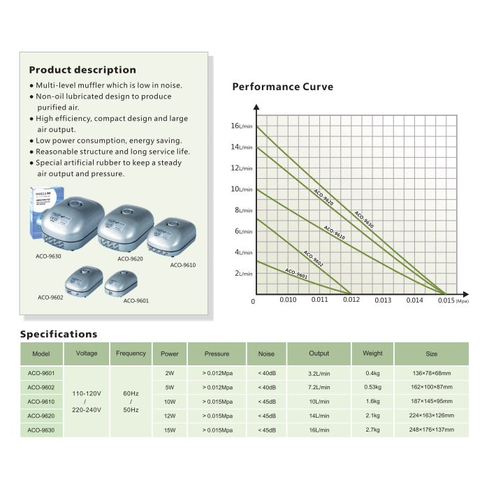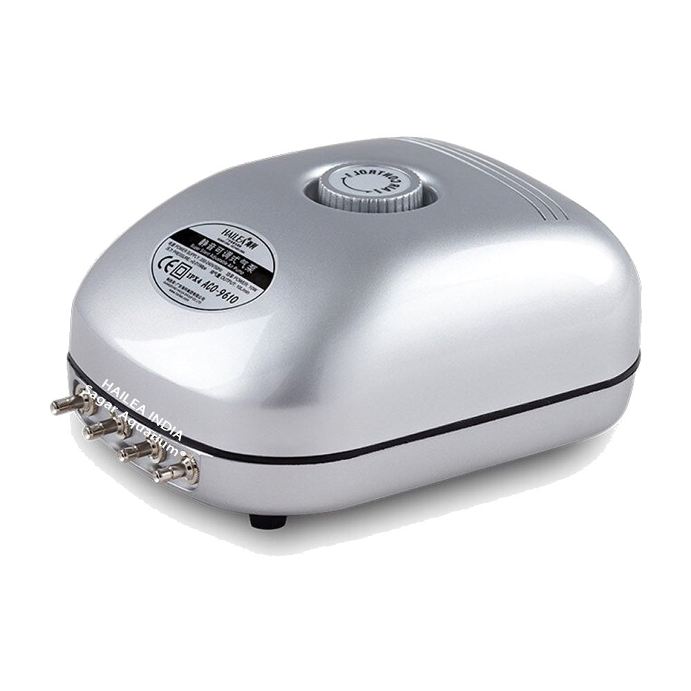Hailea ACO 9610 Adjustable Air Pump Air Compressor Oxygen Air pump comes with Multilevel muffler which is low in noise, non-oil lubricating design.