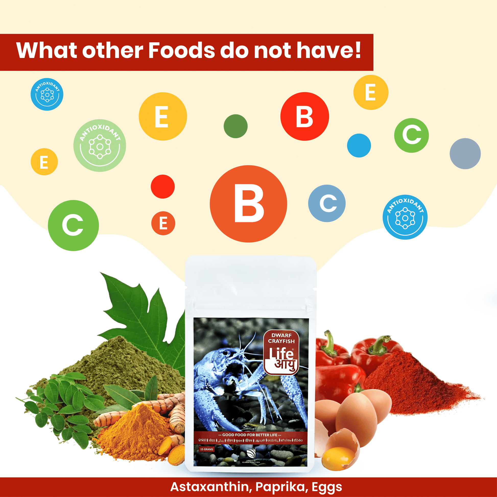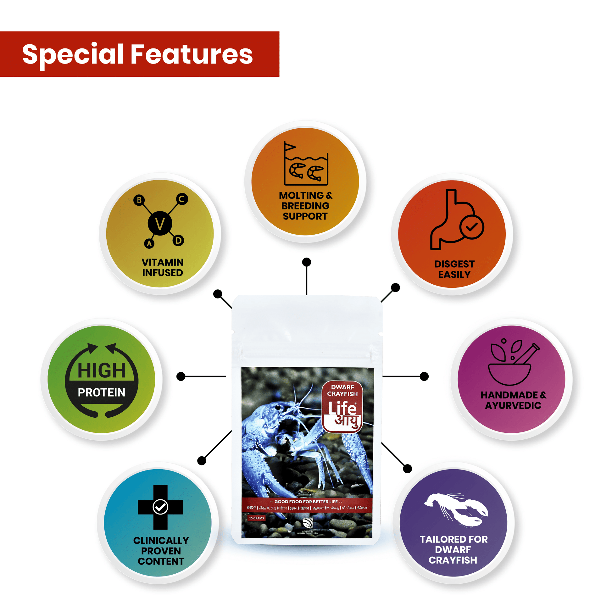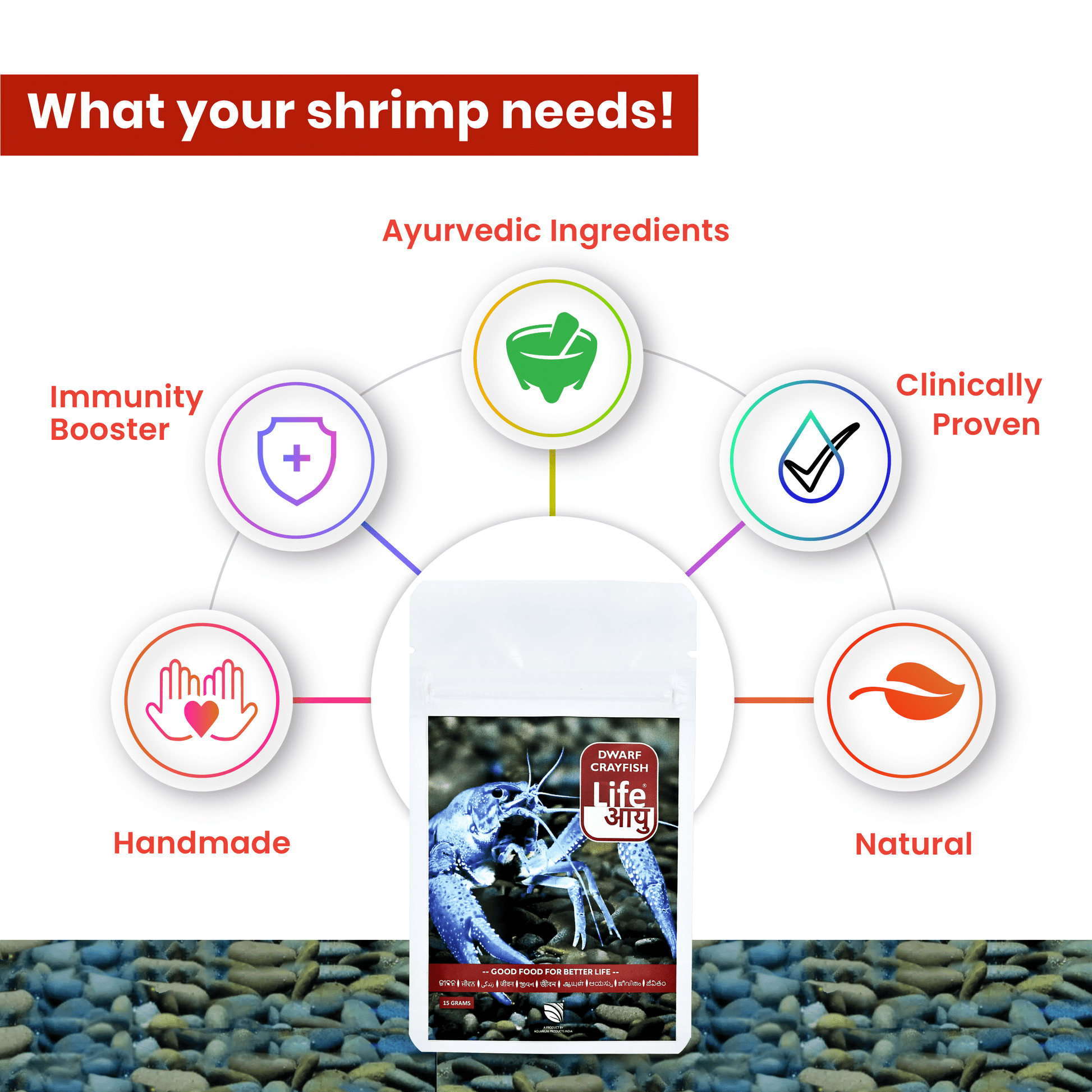 Life Aayu Dwarf Crayfish Blue Food for Breeding & Growth is a high-quality, digestion-friendly shrimp food made with handmade and natural ingredients. Formulated with a unique blend of immunity-boosting Ayurvedic herbs, this food ensures the healthy development of shrimp. Its clinically proven formula includes ingredients like fish meal, shrimp meal, spirulina, and special additives that aid in breeding, molting, and growth. This food keeps aquarium water clean, ensuring a healthy environment for your shrimp.
