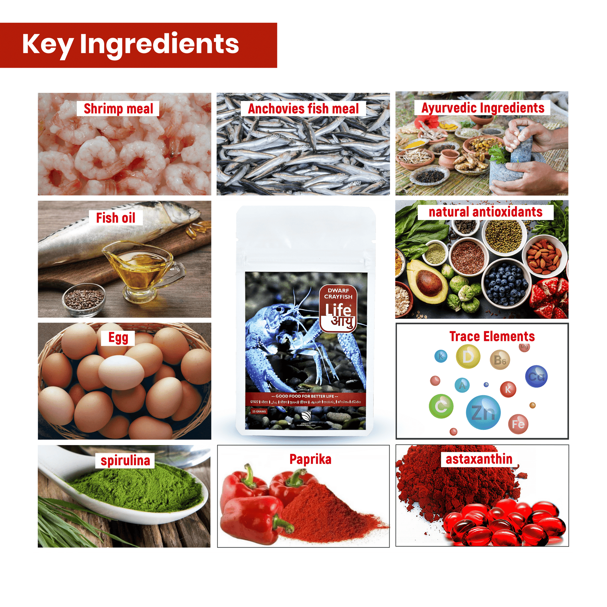 Fish meal, shrimp meal, wheat gluten, maida, soy protein, whole eggs, spirulina, astaxanthin, lutein, paprika, bile salt, potassium sorbate, calcium propionate, fish oil, guar gum, iodized salt, choline chloride, and special ingredients to support better breeding, molting, and growth.