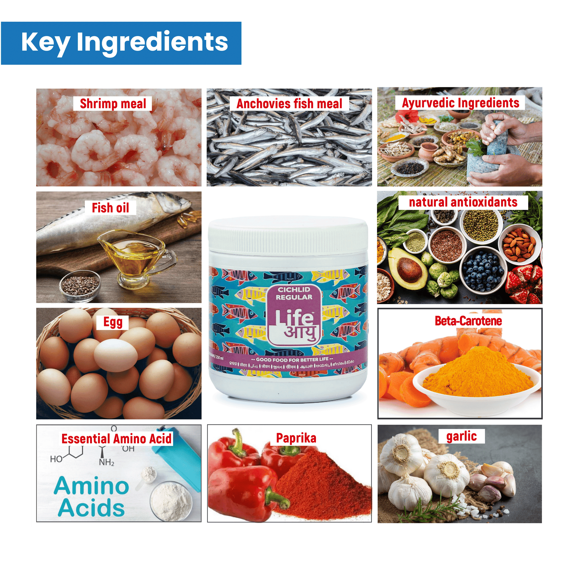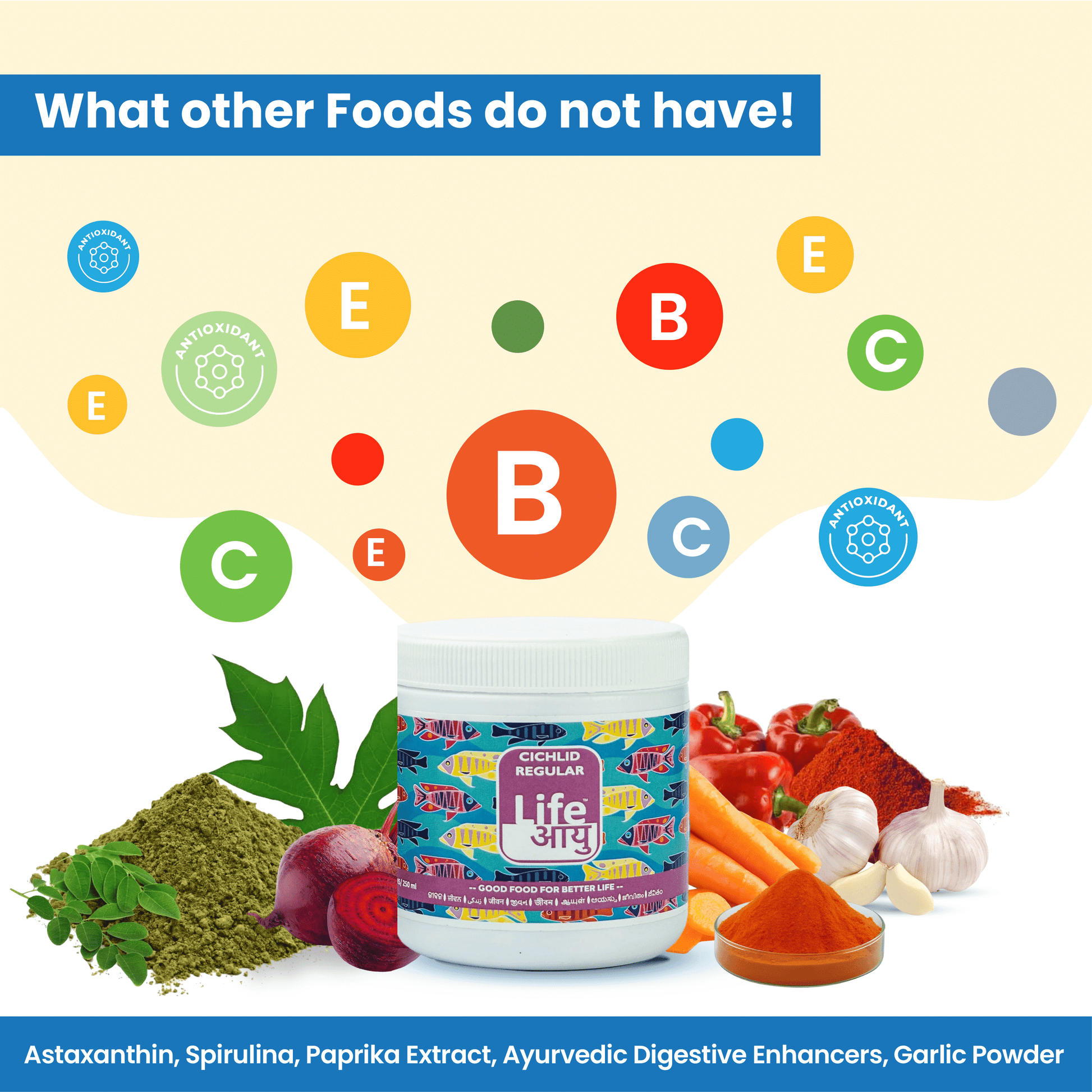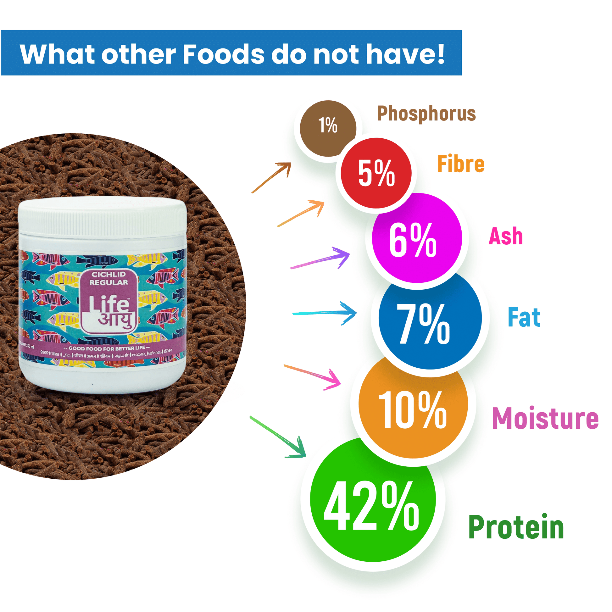 A1: Unlike mass-produced food, Life AAYU Cichlid Regular is handmade, ayurvedic, and contains no harsh chemicals. It improves both health and color, naturally.