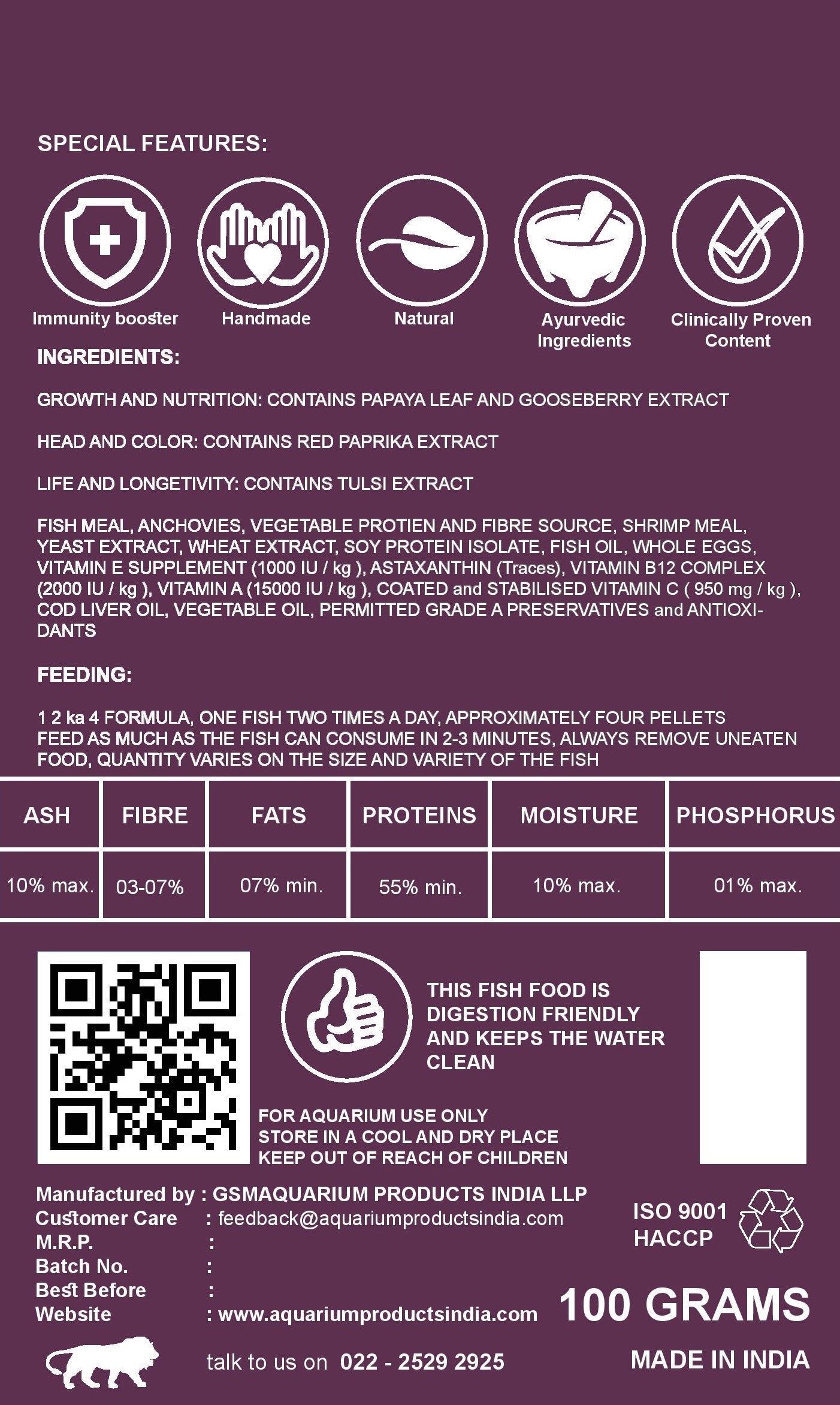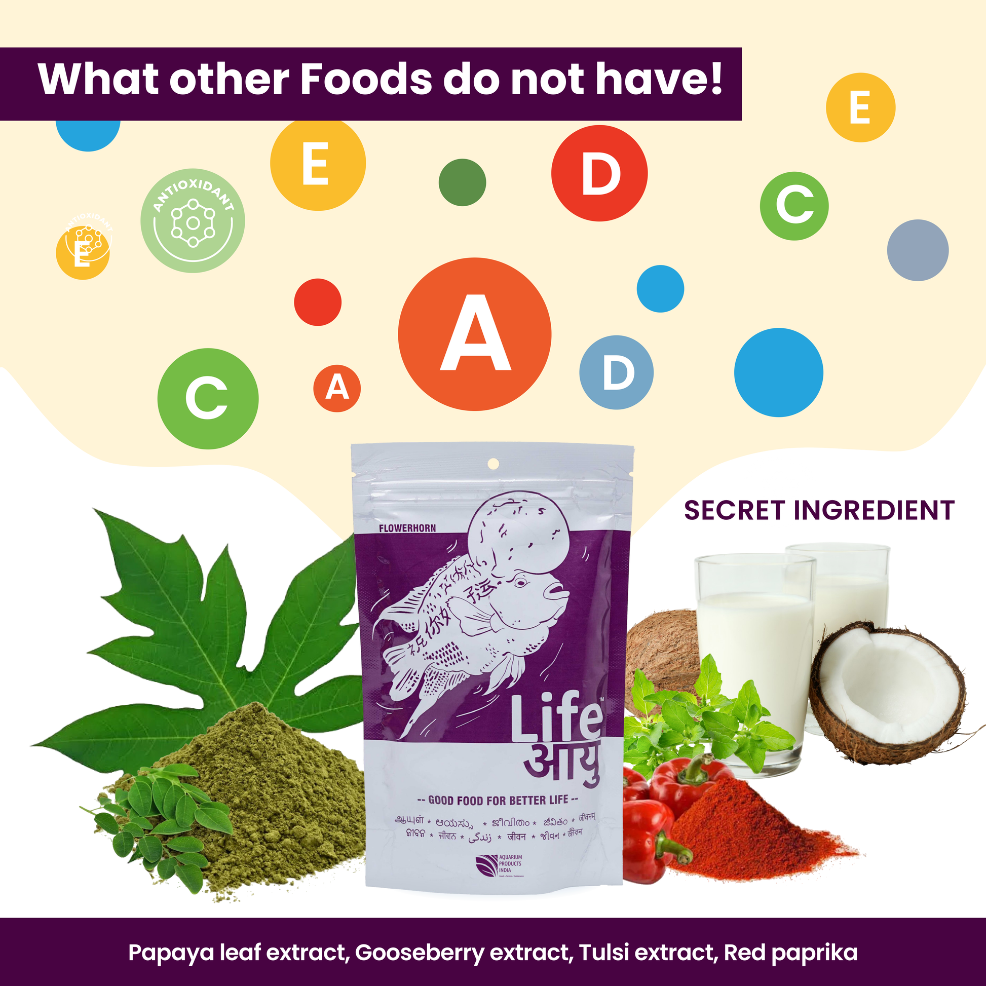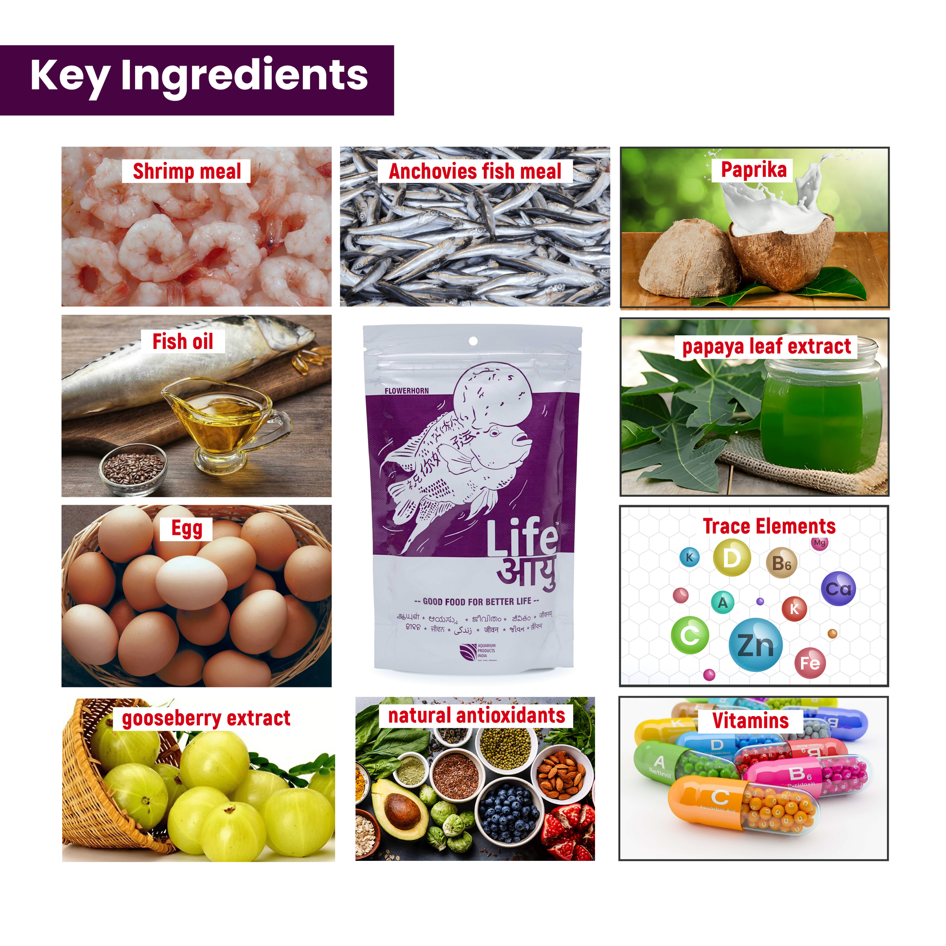 Fish meal, anchovies, shrimp meal, soy protein isolate, yeast extract, wheat extract, fish oil, whole eggs, papaya leaf extract, gooseberry extract, tulsi extract, red paprika, vitamin E, vitamin B12 complex (2000 IU/kg), vitamin A (15000 IU/kg), stabilized vitamin C (950 mg/kg), cod liver oil, vegetable oil, astaxanthin (traces), permitted preservatives, antioxidants