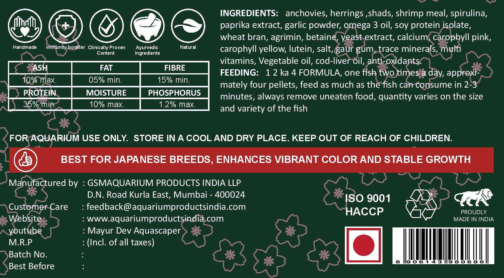 Floating pellet food specially formulated for Japanese koi breeds to improve growth, color vibrancy, and immunity using Ayurvedic and natural ingredients.