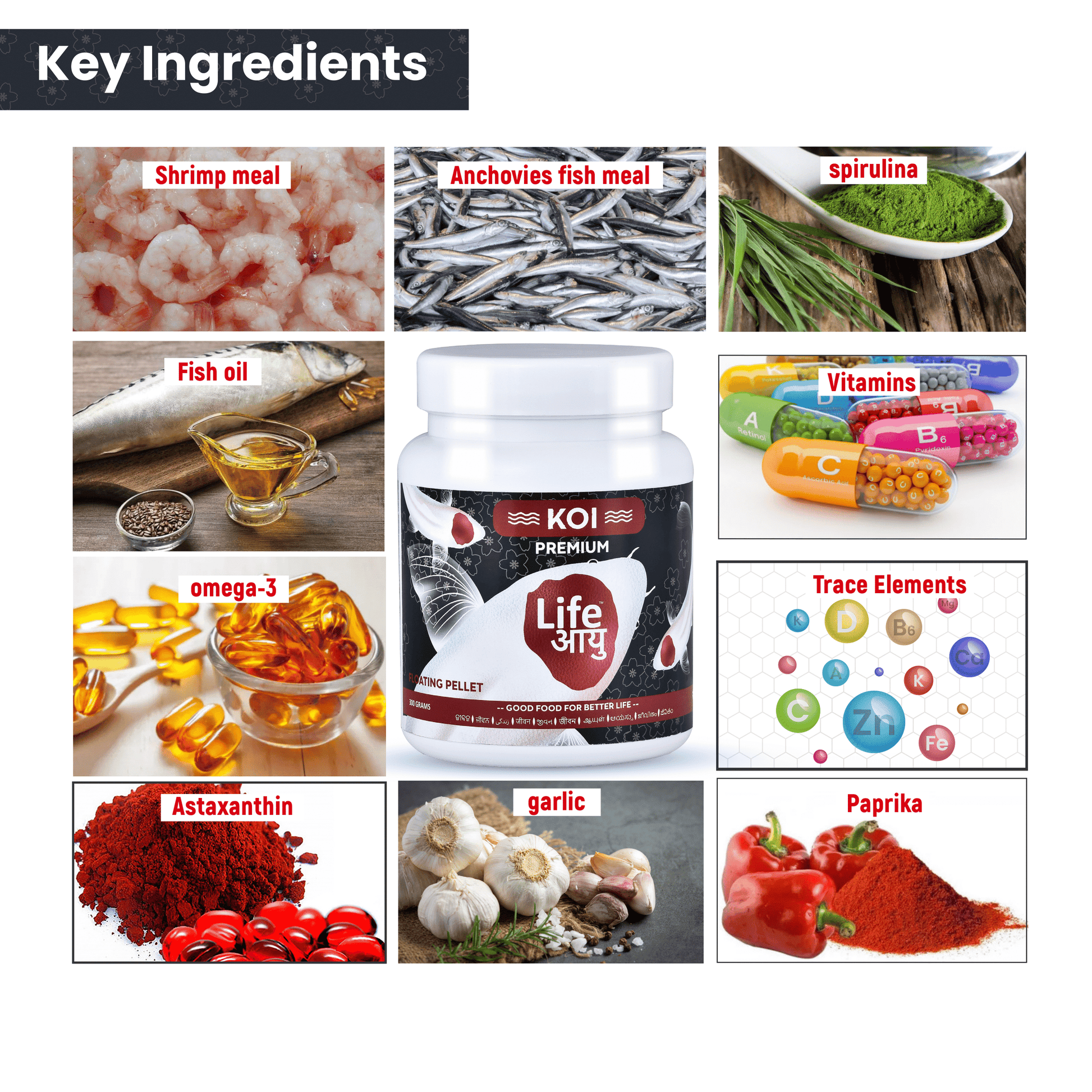 Anchovies, shrimp meal, spirulina, paprika extract, garlic powder, omega-3 oil, soy protein isolate, wheat flour, yeast extract, cod liver oil, multivitamins, minerals, astaxanthin, guar gum, and Ayurvedic herbal binders.