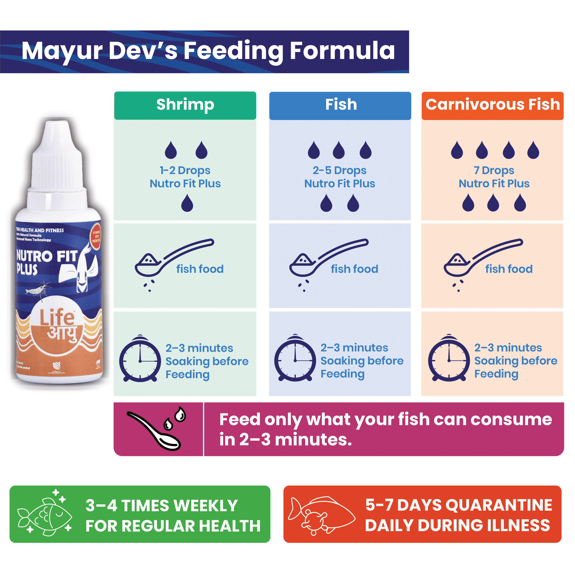 For Fish: Mix 2–5 drops of Nutro Fit Plus with 1 teaspoon of food. Let it soak for 5–10 minutes before feeding.