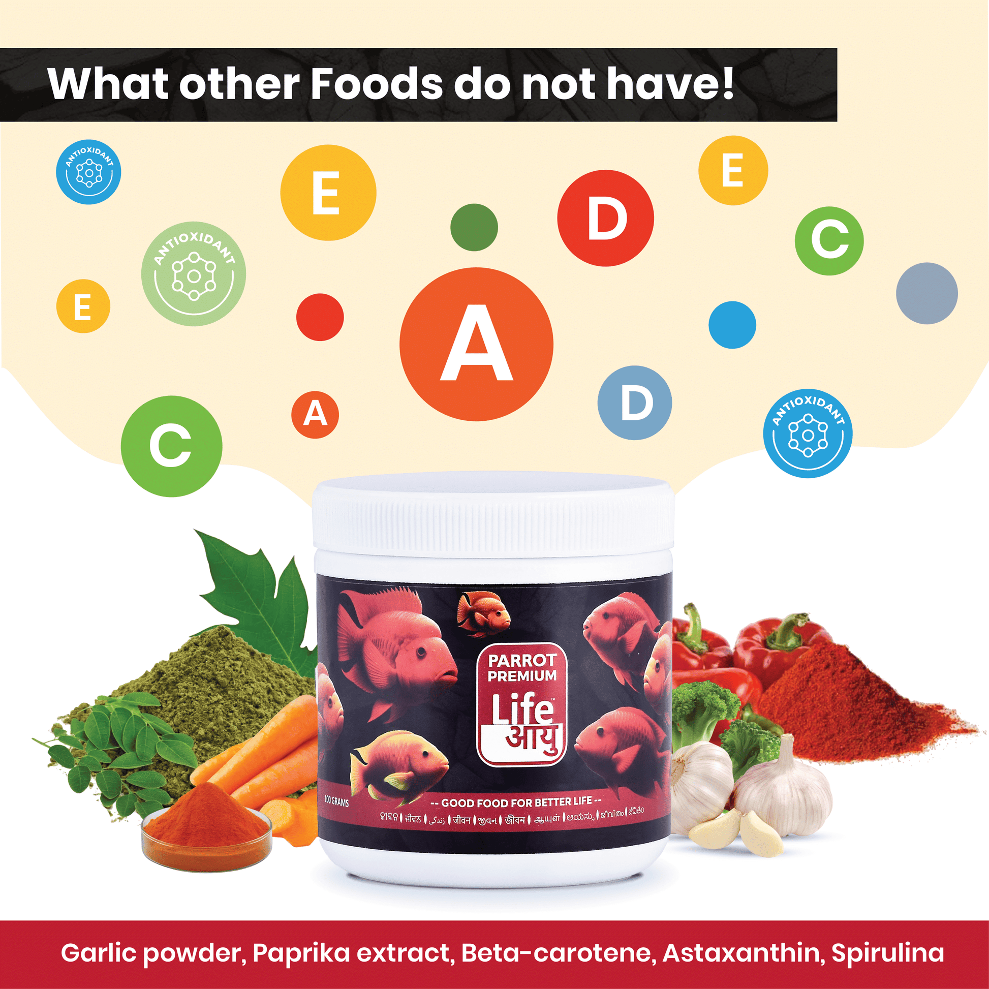 Life AAYU Parrot Premium Fish Food is crafted to naturally intensify red and orange hues, boost immunity, and promote healthy digestion. Powered by Ayurvedic wisdom and marine proteins, this feed keeps your parrot fish thriving and brilliantly colored—all while keeping your aquarium water clean.