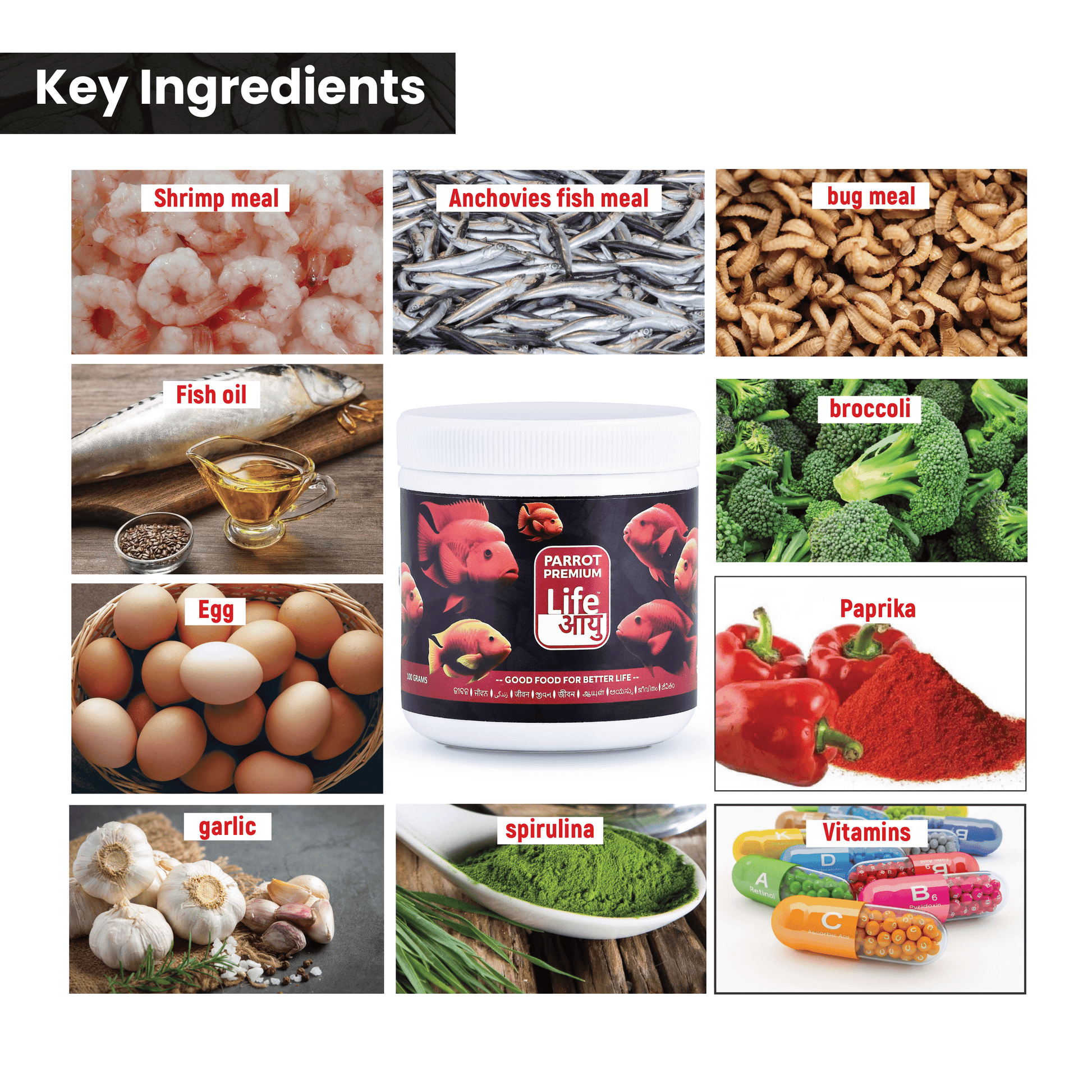 Shrimp meal, anchovy meal, bug meal, wheat extract, beta-carotene, spirulina, garlic, fish oil (Omega-3), soy protein isolate, whole eggs, vitamin A, vitamin C, vitamin E, vitamin B-complex, natural antioxidants, Ayurvedic herbal extracts