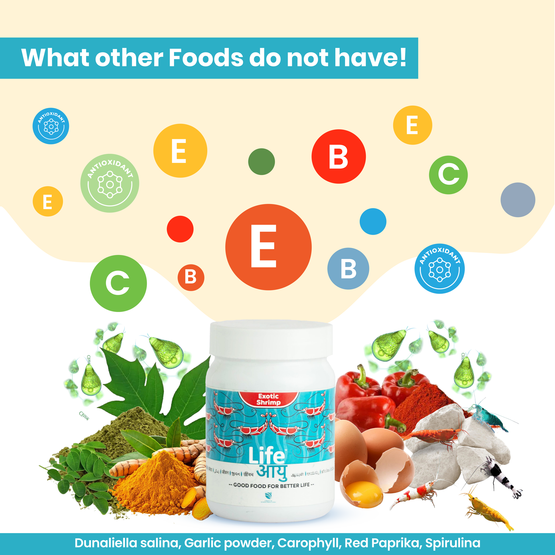Dunaliella salina, garlic powder, carophyll, red paprika, fish oil, coconut oil, omega-3 oil, chitosan, shrimp meal, fish meal, wheat gluten, maida, yeast extract, spirulina, vitamin E, vitamin B-complex, vitamin C