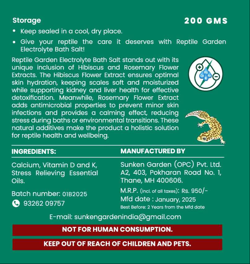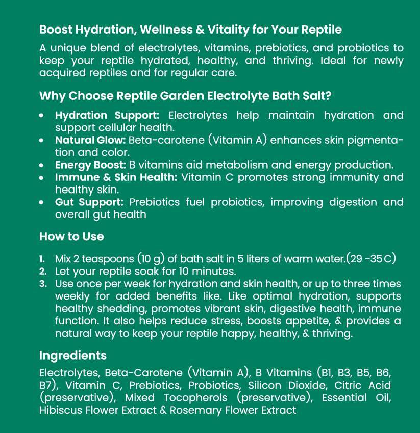 Reptile Garden Lizard and Dragon Electrolyte Bath Powder is the ultimate solution to boost hydration, wellness, and vitality in your reptiles. This unique formula blends electrolytes, vitamins, prebiotics, and probiotics to help your reptile thrive. Perfect for newly acquired reptiles or as a regular care product to support hydration, digestion, immune function, and skin health.