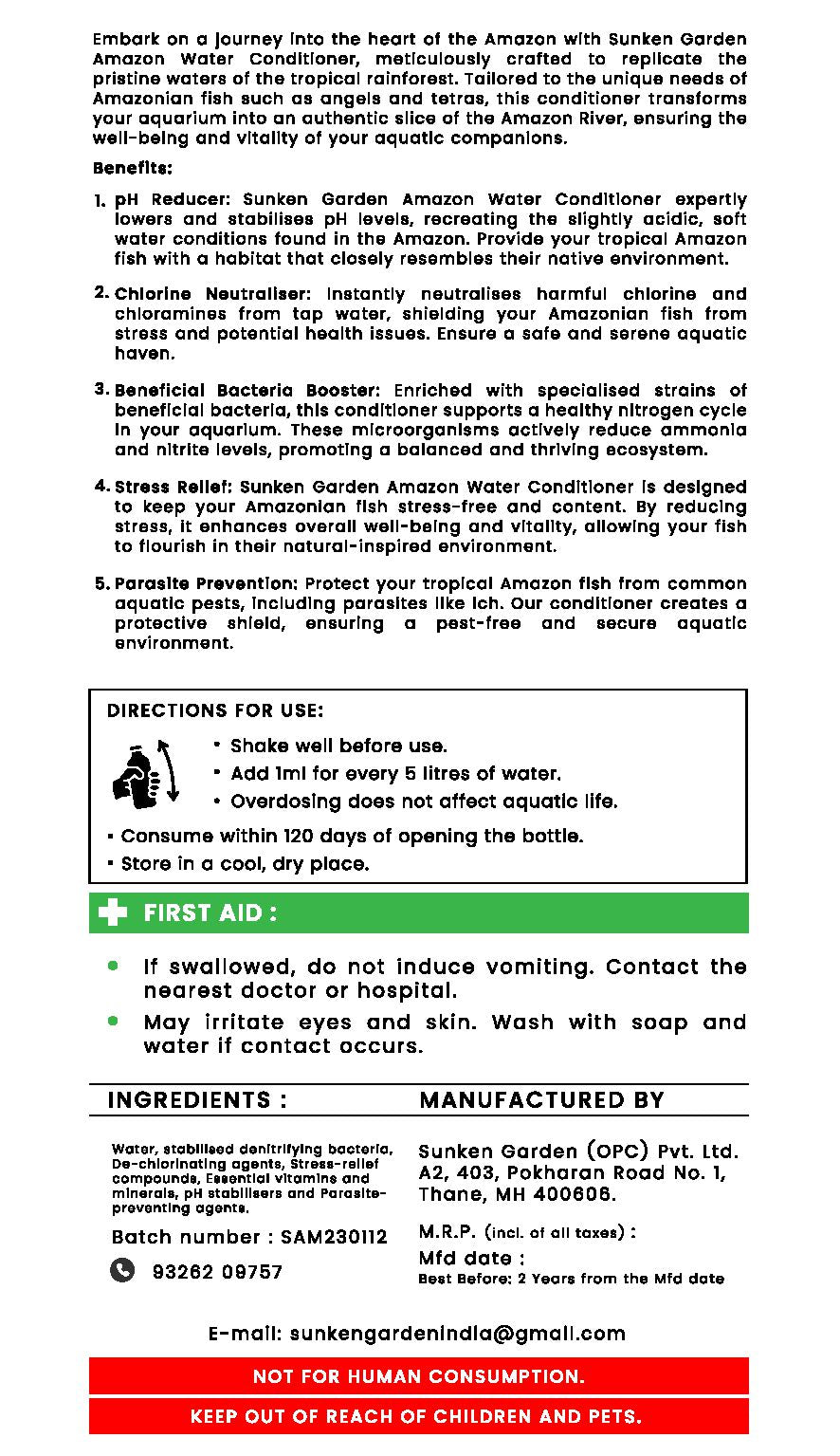 Embark on a journey into the heart of the Amazon with Sunken Garden Amazon Fish Water Conditioner. This product is meticulously crafted to replicate the pristine waters of the tropical rainforest, tailored to the unique needs of Amazonian fish such as angels and tetras. Transform your aquarium into an authentic slice of the Amazon River, ensuring the well-being and vitality of your aquatic companions.