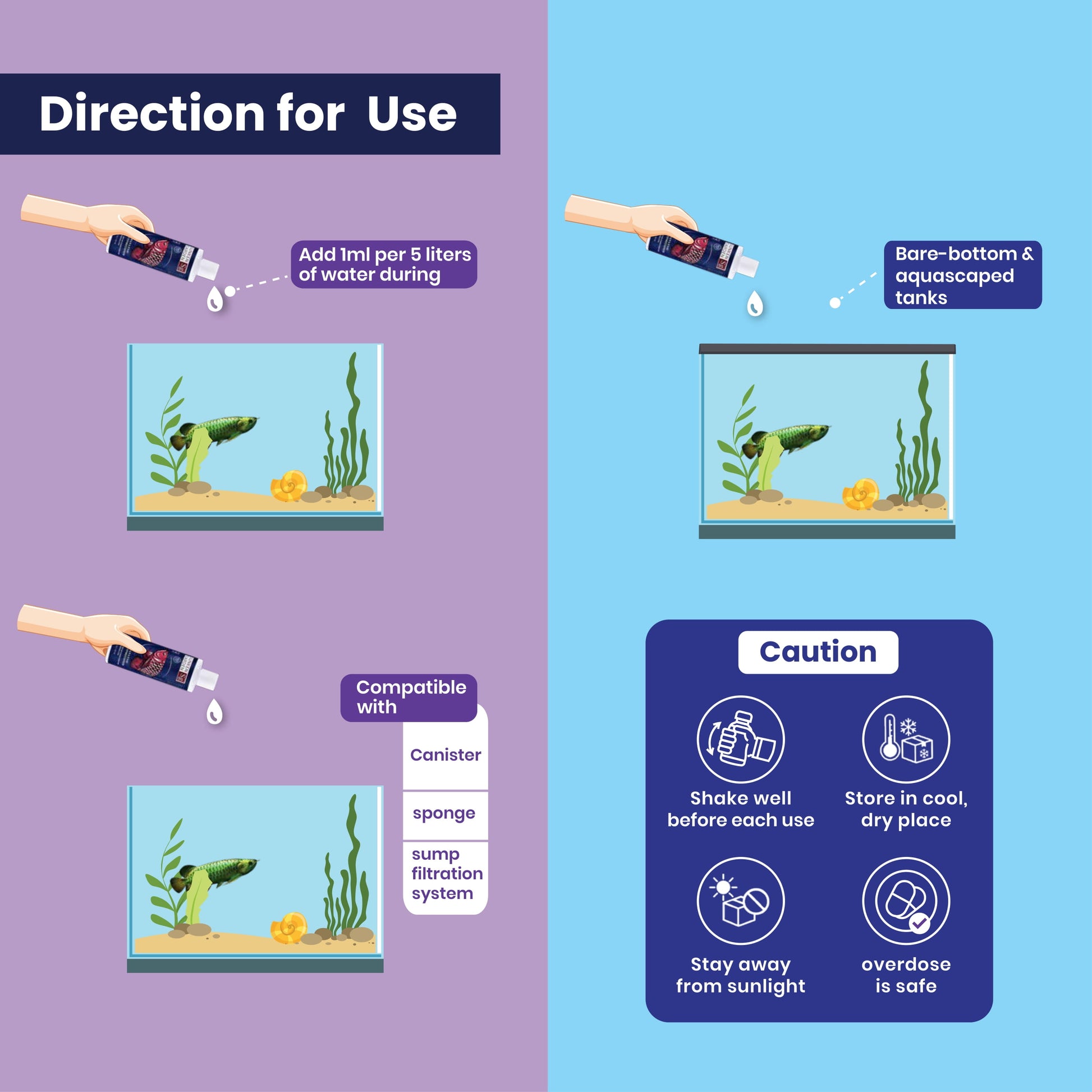 ✔ Add 1 ml per 5 liters during water changes or pond refills.