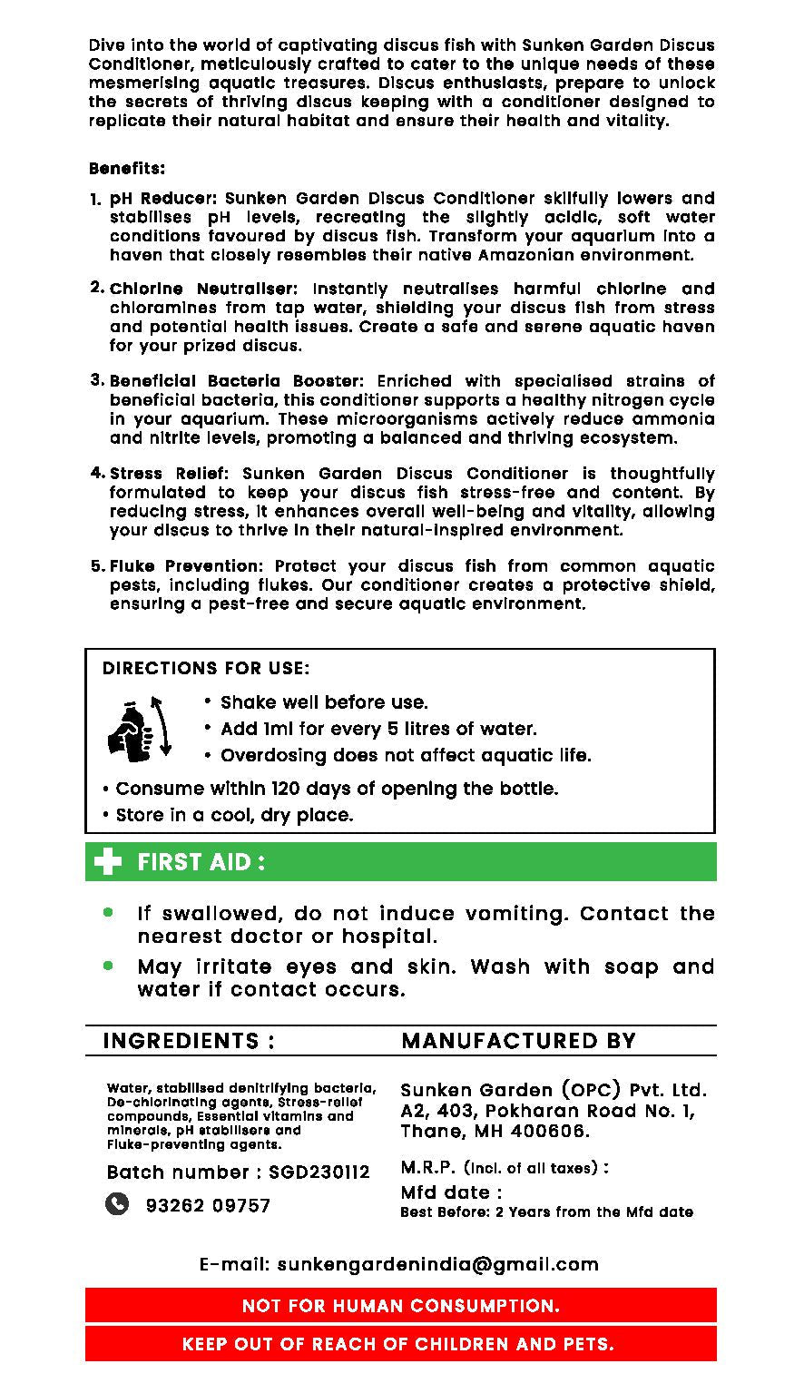 Sunken Garden Discus Fish Water Conditioner is a premium, precision-crafted formula designed to meet the exact water chemistry needs of Discus. From pH balancing and chlorine removal to parasite protection and gut-calming relief, it creates a safe, low-stress environment where Discus thrive in color, health, and harmony.
